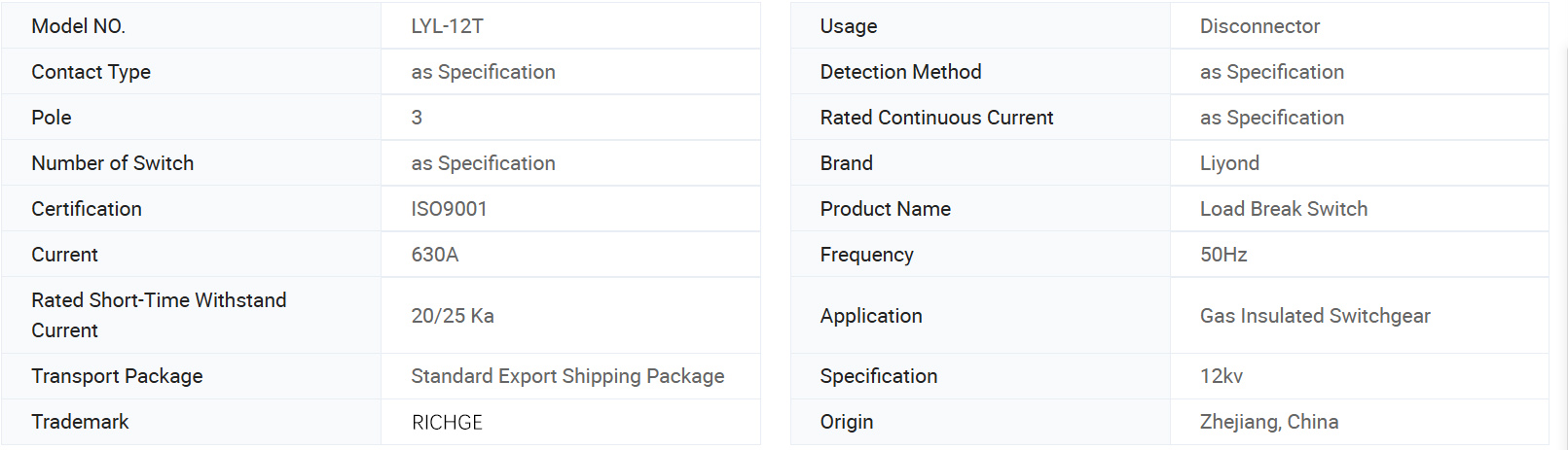 سوئیچ بار LYL-12T با الزامات مربوطه GB3804-2004 "سوئیچ بار ولتاژ بالا AC 3.6kV~40.5kV" و GB16926-1997 "دستگاه ترکیبی سوئیچ بار ولتاژ بالا و فیوز" مطابقت دارد. مدار اصلی: 630A-20kA (4s)، 25kA (3s)؛ عمر مکانیکی: 5000 بار; مدار زمین: 20 کیلو آمپر (2 ثانیه)؛ عمر مکانیکی: 2000 بار.