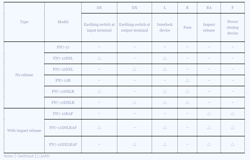کلید قطع بار سری FN7 معمولاً با مکانیزم فنری برای روشن و خاموش کردن منبع ارائه می شود، اما گزینه ای با مدار شکن خلاء نیز موجود است. البته گزینه با مدار شکن خلاء گرانتر است. انتخاب بین این دو کاملا به مشتری بستگی دارد. کلید قطع بار با مدارشکن خلاء گزینه قابل اعتمادتری است. کلید قطع بار 36 کیلوولت FN7 با ولتاژ بالا AC ترکیبی فیوز .