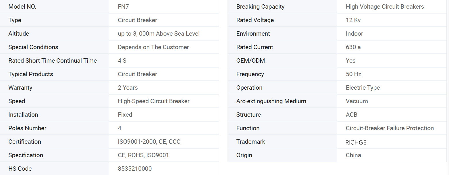 سوئیچ بار فشار قوی FN7-12 AC نوع جدیدی از سوئیچ بار فشار قوی داخلی داخلی است که گاز تولید می کند. برای سیستم های برق متناوب سه فاز با AC 50 هرتز و ولتاژ نامی 12 کیلو ولت مناسب است. برای قطع جریان بار و بستن جریان اتصال کوتاه استفاده می شود.