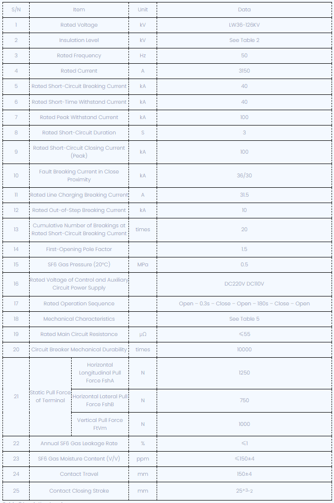 این محصول از گاز SF6 به عنوان محیط خاموش و عایق قوس استفاده می کند. این مجهز به جدیدترین فناوری خاموش کننده قوس خود انرژی یافته است و دارای مکانیسم جدیدی است که بهار انجام می شود. LW36-126/3150-40 عمر الکتریکی طولانی ، تلاش کم کار ، سر و صدای کم و قابلیت اطمینان بالا را ارائه می دهد و آن را به عنوان قابل اطمینان ترین انتخاب برای مناطق با ارتفاع بالا یا سیستم های قدرت 132kV تبدیل می کند. همچنین می تواند محصولات وارداتی را از همان نوع جایگزین کند.
