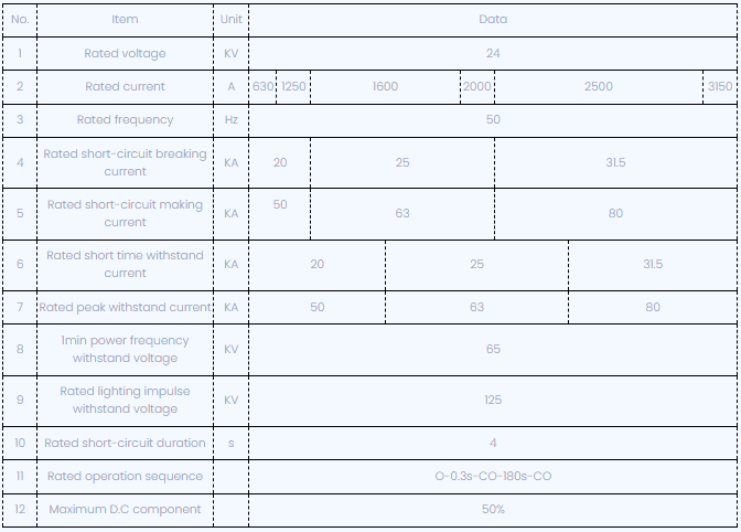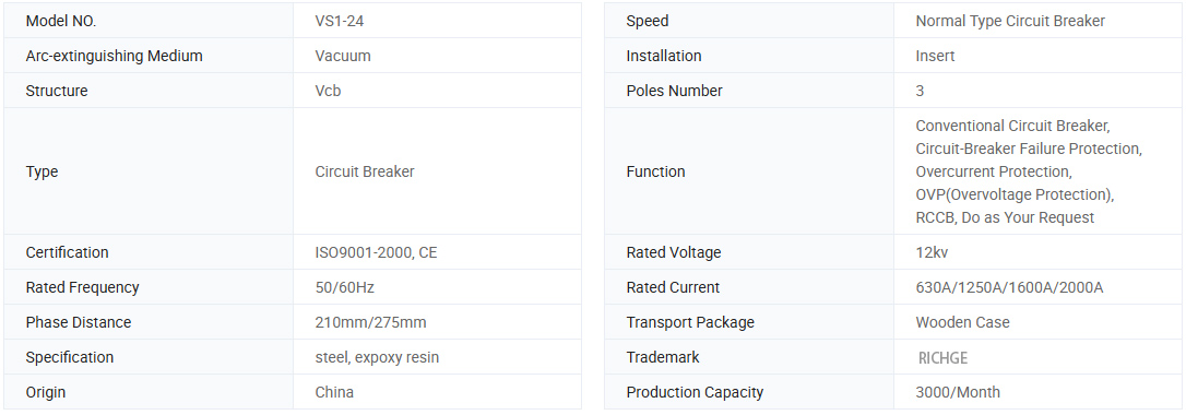 سری VS1-24 از شکن خلاء ولتاژ بالای ولتاژ داخلی با سیلندر عایق بندی شده مشترک ، سه فرای A.C. 50 هرتز تجهیزات توزیع قدرت داخلی با ولتاژ امتیاز 24 کیلو ولت است. این مورد برای محافظت از کنترل تجهیزات الکتریکی در زمینه های صنعت و معدن ، نیروگاه ها و پست ها استفاده می شود. این نوع قطع کننده مدار خلاء مطابق با استانداردهای ملی و مقررات استاندارد IEC است ، توانایی به درجه M2-E2-C2 می رسد.