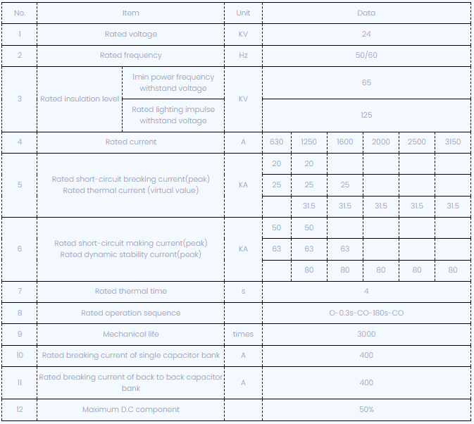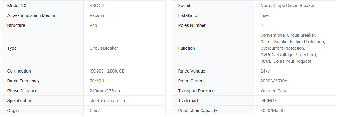 سری VSG-24 از شکن خلاء ولتاژ بالای ولتاژ داخلی با قطب های تعبیه شده سه فاز A.C 50Hz تجهیزات توزیع قدرت داخلی با ولتاژ دارای امتیاز 24kV است. از آن برای محافظت و کنترل تجهیزات برقی در زمینه های صنعت و شرکت مینگ ، نیروگاه ها و پست های پست استفاده می شود.